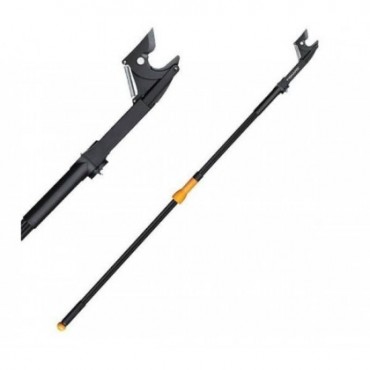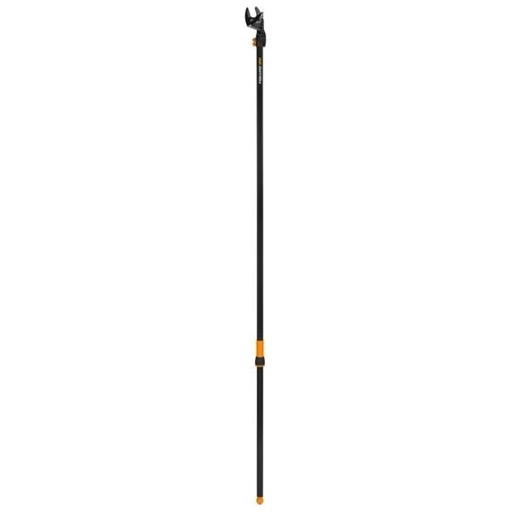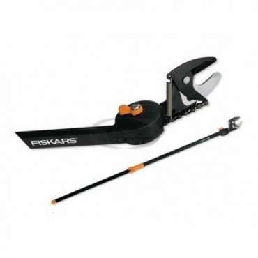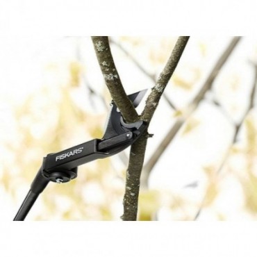 Sekator uniwersalny Fiskars z obrotową głowicą oraz skutecznym mechanizmem tnącym. Dzięki tym rozwiązaniom trudno dostępne gałęzi w koronie drzewa można obcinać bez użycia drabiny, a cięcie staje się szybkie, łatwie i bezpieczne. Taśma nie wymaga regulacji, jest prowadzona wewnątrz narzędzia, co chroni ją przed splątywaniem i zaczepianiem o gałęzie podczas cięcia.