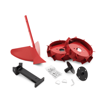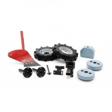 Kompletny zestaw pługa i kół umożliwiający odwracanie skib i tworzenie bruzd, przy jednoczesnym zasypywaniu chwastów.
