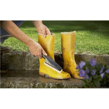 GARDENA ręczna szczotka do szorowania podłączona do wody za pomocą elementów przyłączeniowych Original GARDENA System umożliwia czyszczenie odpornych powierzchni bez wysiłku. Dzięki elastycznemu, płaskiemu korpusowi szczotka umożliwia dotarcie nawet do najwęższych miejsc na narzędziach ogrodowych, kaloszach, koszach na śmieci itd. Przepływ wody można bezstopniowo regulować, a także zamykać. W celu zwiększenia skuteczności czyszczenia można stosować wkłady mydlane GARDENA. Czyszczenie może być naprawdę łatwe.